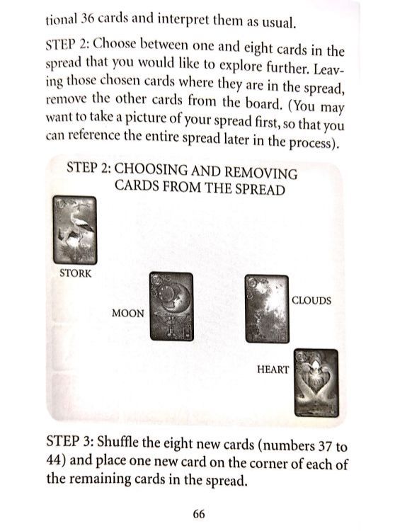 Es wird präzisiert, dass die beiden zusätzlichen Karten 28 - Herr und 29 - Dame beibehalten / zum Deck hinzugefügt werden können, wenn eine Legung mehrere Personen betrifft (ich bin kaum von der Relevanz eines solchen Vorschlags überzeugt). Die Eulen (die zweite Version der Karte 12 - Vögel) kann ebenfalls zum Deck hinzugefügt werden, zusätzlich zur ursprünglichen Karte, indem man ihr verschiedene Bedeutungen zuweist. Leider wird in diesem Fall keine neue Interpretation gegeben.