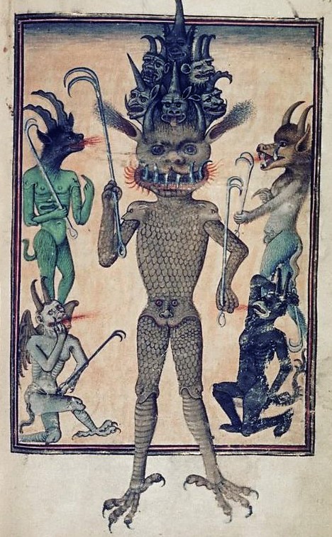 The earliest representations of the devil as a tempter and torturer come from illuminated manuscripts depicting the temptation of Christ. For example, the devil in the Saint Albain manuscript has a human posture but the fur on his legs, the tail, the claws on his feet, and the animal ears remind that the devil is a fallen angel.