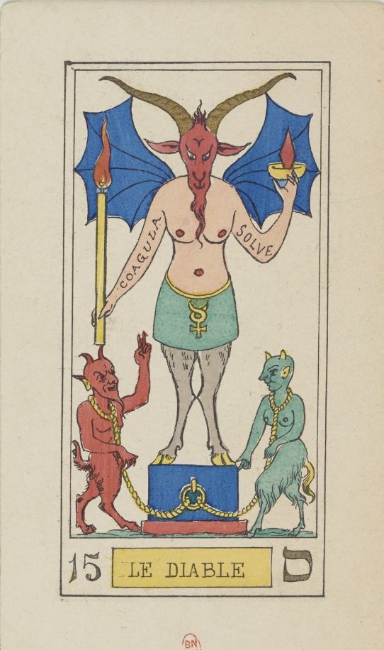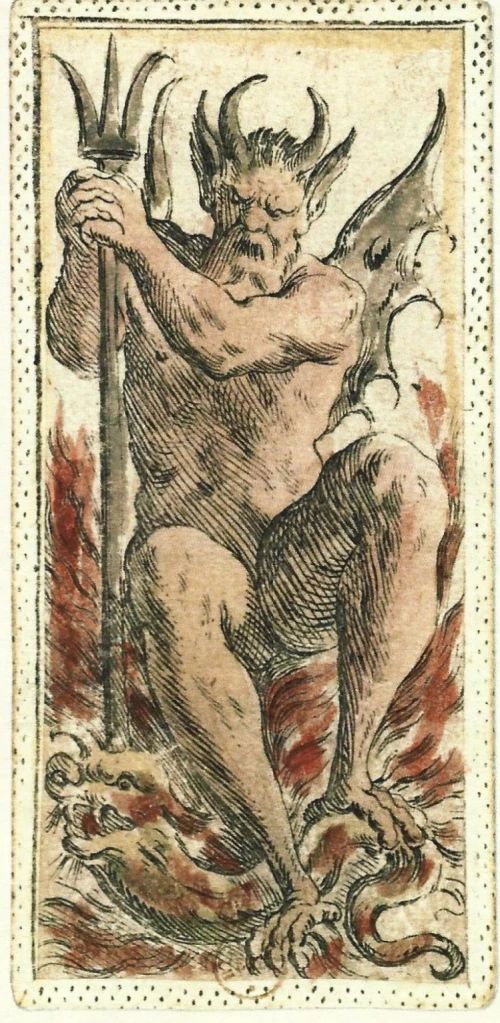 The earliest printed tarot cards depict devils who seem mischievous rather than threatening. The face on the belly of the Budapest Devil with red angel wings might be attached, might be a theater costume. Medieval theater and its representations of the Devil were ways to convey moral and religious lessons to spectators. The Rosenwald Devil seems to wear a costume of poorly drawn leaves or fur. The devils have goat horns and seem rather cheerful, playful, and carefree. The Inquisition flail has evolved into a trident, as later in the century.