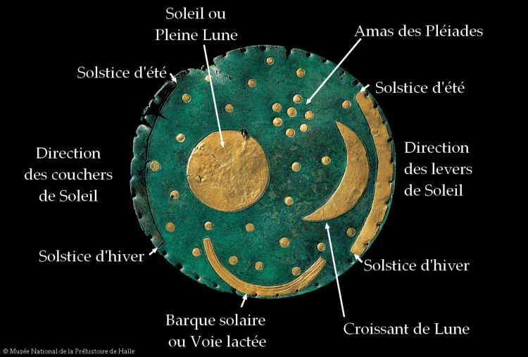 Discovered in Germany and dated to around 1600 BC, the Nebra Disk is one of the oldest concrete representations of the cosmos. This remarkable bronze artifact, decorated with gold inlays, shows a clearly identifiable crescent moon, a full circle (interpreted as the full moon or the sun), and several stars, including a group that looks like the Pleiades. Archaeologists now agree it is much more than a simple illustration: it was a real astronomical instrument used to harmonize the lunar and solar calendars.