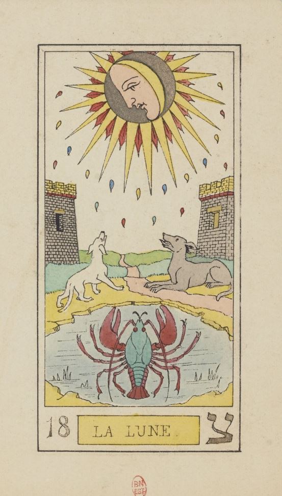 Medieval bestiaries, those collections of real or fantastic animals explained from a Christian point of view, often connect the moon to special creatures like the owl (symbol of night wisdom but also heresy), the unicorn (purity), or the wolf (danger). This link between the moon and special animals comes before the animals we later see on the tarot card: dogs, wolves, crayfish, or hybrid creatures.