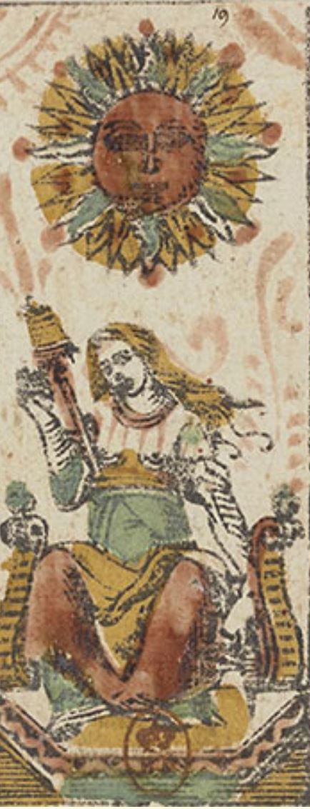 The oldest known Sun showing a woman with distaff and spindle appears in the famous Charles VI tarot, painted for an Italian aristocrat in the middle of the 15th century. This card establishes a deep symbolic link with Clotho, one of the three Fates of Greek mythology who spins the thread of individual destiny.