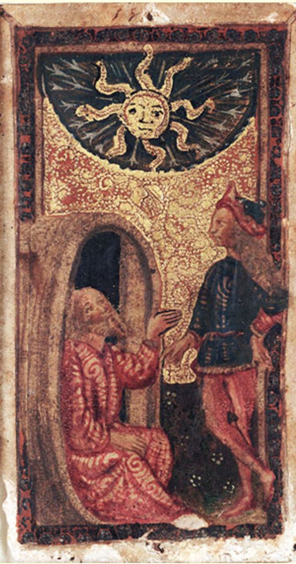 Another Sun card, created in the middle of the 15th century for the Duke of Ferrara, illustrates one of the most famous anecdotes of Antiquity: the meeting between Alexander the Great and the cynic philosopher Diogenes. This story, reported by Plutarch and taken up by Shakespeare, tells how Diogenes, living in a barrel by philosophical choice, asked the emperor to step aside because he was casting shade on him.
