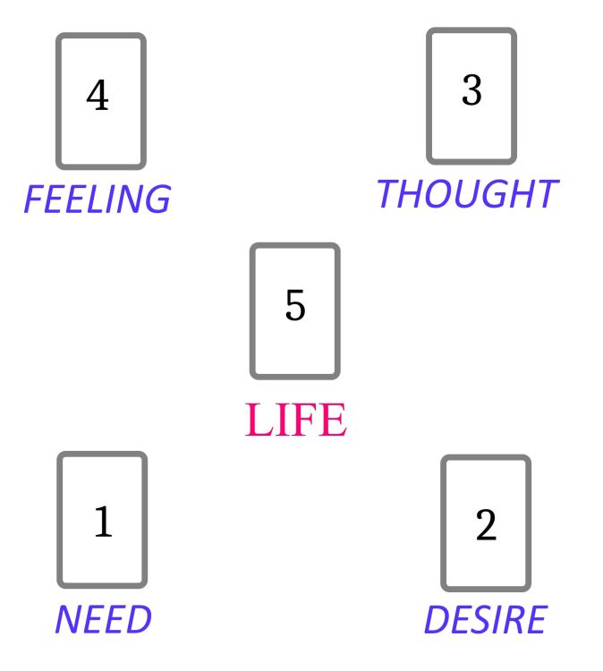 Light preparation: Rather than preparing 10 decks of cards, you can simply group the cards into 3 piles (pip cards, court cards, major arcana). Thus, any suit (Pentacles, Wands, Swords, Cups) can be found in the 4 positions "Need", "Desire", "Thought", "Feeling". And any major arcana can be found in position No.5: "Life". This adds subtlety and finesse to the interpretation.