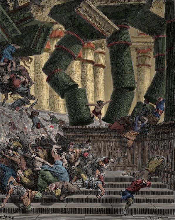 Dans la Bible, Samson, héros du livre des Juges, est décrit comme l'homme le plus fort du monde. Il a affronté les Philistins grâce à sa force surhumaine. Un épisode célèbre raconte qu'il tua mille Philistins avec une mâchoire d'âne. Mais sa force résidait dans ses cheveux longs, un secret que Delilah, sa maîtresse, révéla à ses ennemis. Après avoir été capturé et humilié, Samson, dont les cheveux avaient repoussé, fit s'effondrer le temple de Dagon en poussant sur ses piliers, se sacrifiant pour accomplir une vengeance ultime.