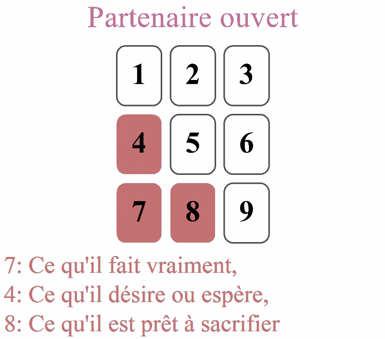 Cette partie du tirage est dédiée à explorer les actions, désirs et sacrifices du partenaire qui se montre plus ouvert dans la relation. Ces trois positions révèlent non seulement ses intentions, mais aussi ce qu’il est prêt à mettre en jeu.