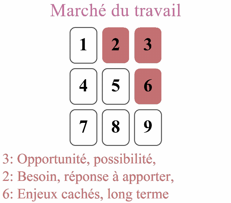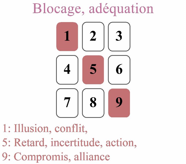 Les cartes situées aux coins (1, 3, 7, 9) sont des indicateurs importants des forces qui soutiennent ou bloquent le développement de la situation :