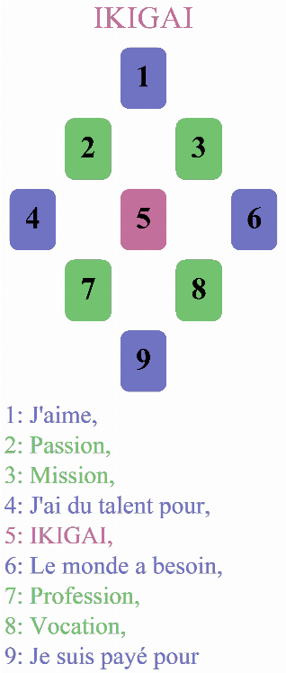 C’est un outil puissant pour construire une vie plus épanouie et pleine de sens. Pour en savoir plus sur l’Ikigai, consultez la page Wikipedia Ikigai ou utiliser le mot-clé "ikigai" dans votre moteur de recherche favori ^_^