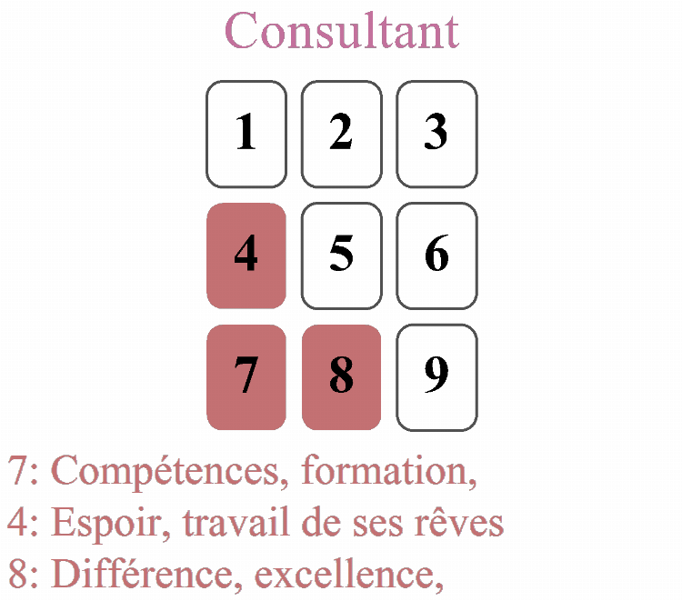 Deux positions clés se concentrent sur l’état émotionnel et psychologique du consultant, offrant des pistes pour son développement. Ces deux cartes fonctionnent en tandem, offrant une vision claire des défis et des solutions.