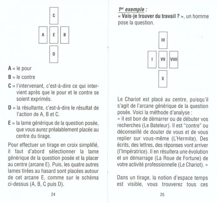 La fin du livret propose deux tirages. D'abord "le tirage à la coupe" en deux cartes, où le consultant coupe le jeu de cartes et retient la carte au-dessous et au-dessus à l'endroit de la coupe. Enfin, le livret se termine par la description d'un tirage en croix simplifié en 5 cartes. Les deux étalements sont accompagnés de plusieurs exemples. L'ensemble est pédagogique, il manque cependant l'explication de la réduction théosophique puisque l'auteur propose 2 emplacements supplémentaires au tirage en croix simplifié. Bruno parle d'additionner deux cartes tirées pour connaître la carte supplémentaire. Les pratiquants avancés imagineront qu'il s'agit d'une réduction théosophique.