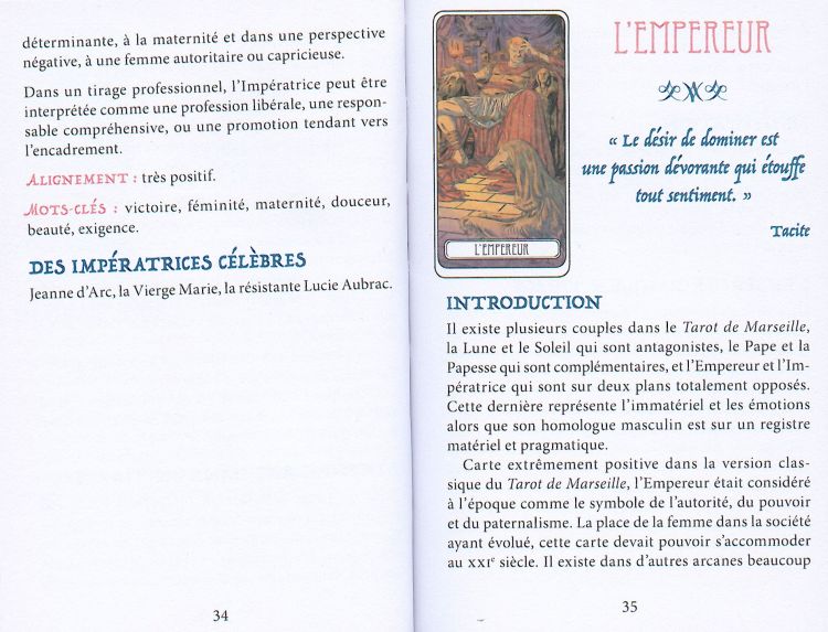 Chacune des triomphes est décrite en deux pages couvrant 4 parties : Introduction, signification, interprétation en tirage, et personnalités célèbres.