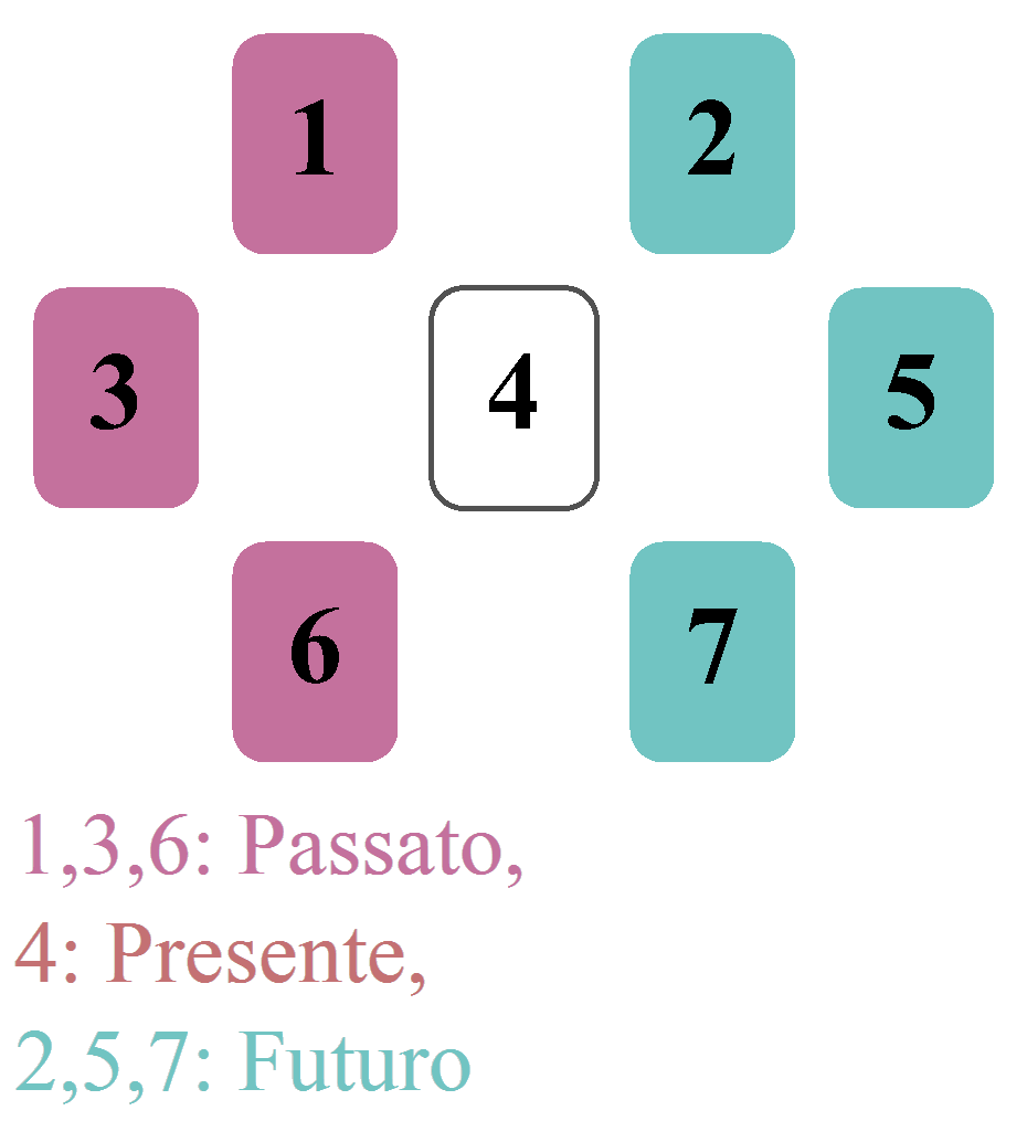 Le posizioni 3 e 5 mostrano quello che ognuno porta alla relazione. La carta centrale (4) riflette lo stato attuale della relazione: il suo equilibrio, le sue forze o le sue tensioni. Determinare se la relazione è armoniosa o se necessita di un riaggiustamento nel modo di condividere le responsabilità o le emozioni.