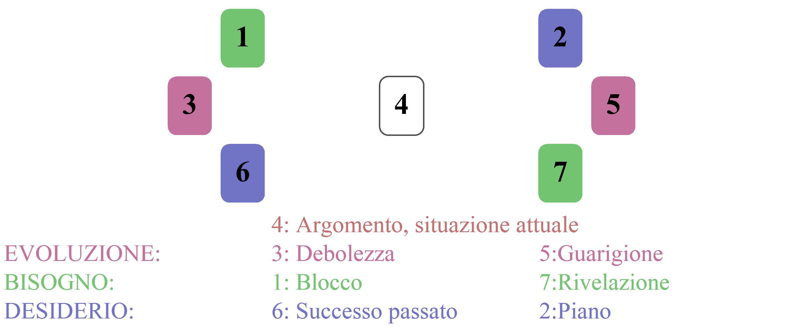 Il consulto in 7 carte è un consulto ideale per i principianti che vengono dai Tarocchi e che hanno l'abitudine di fare consulti con posizioni. Qui, piano piano, si inizia a leggere le carte Lenormand associandole per riga e per colonna.
