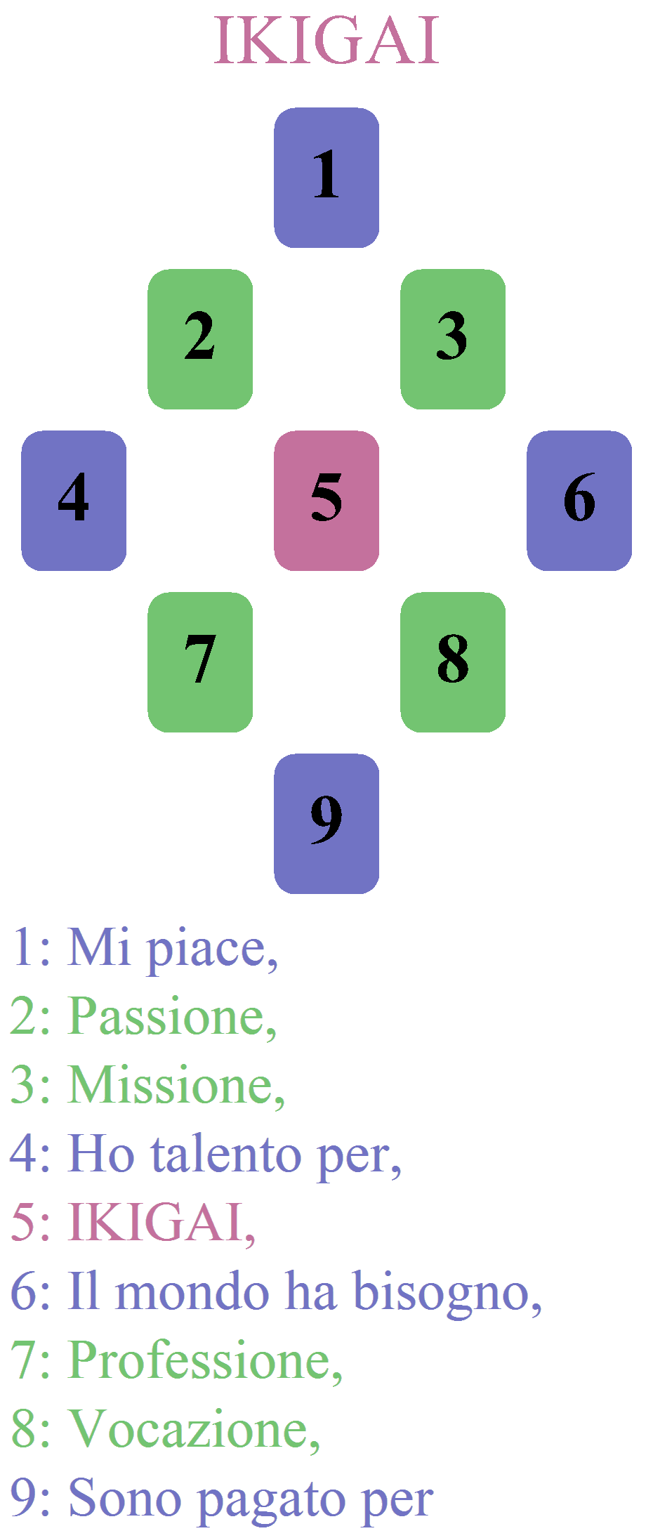Questo consulto utilizza una disposizione di nove carte che rappresenta i diversi pilastri dell'Ikigai: