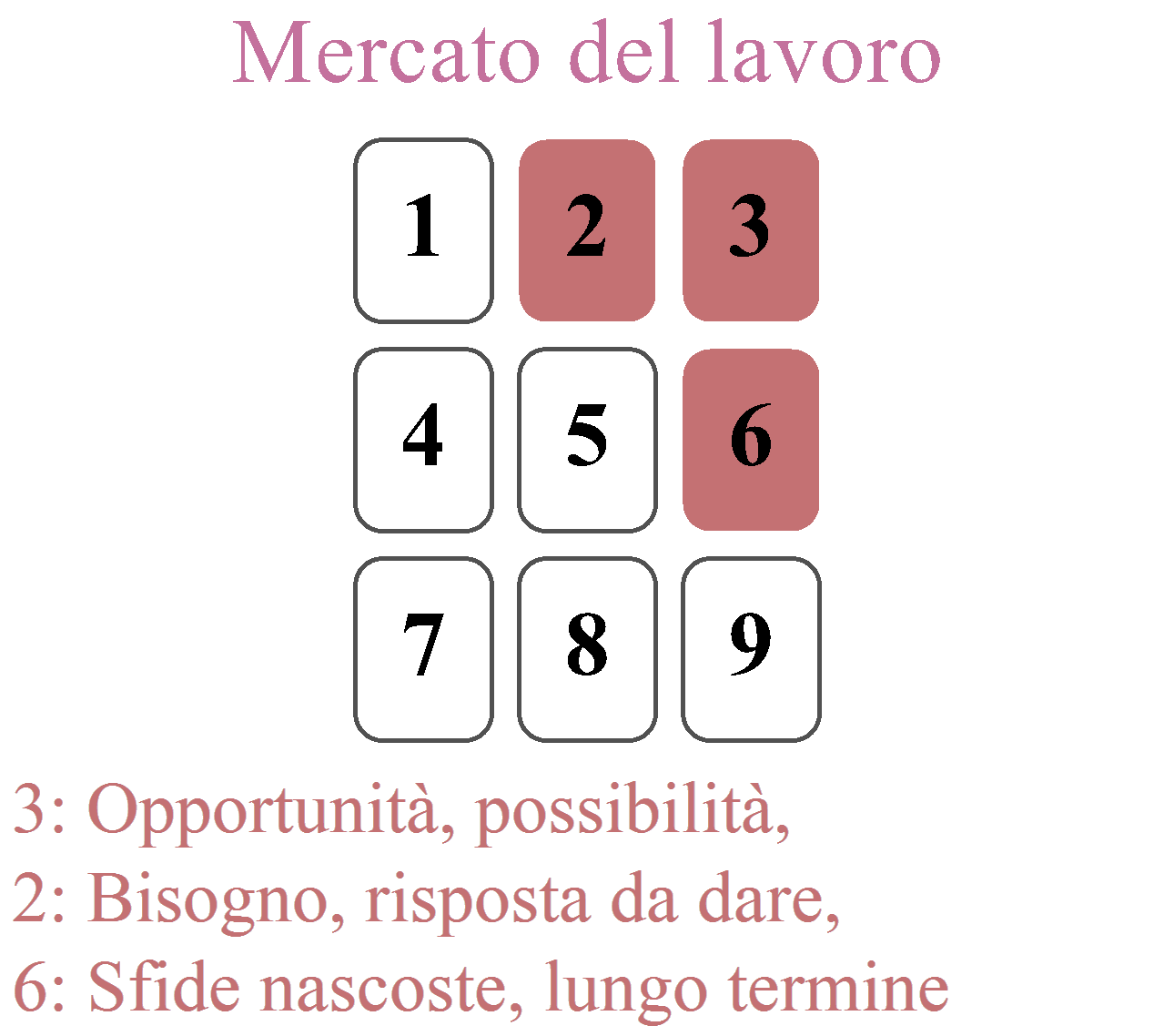 Le posizioni 3, 4 e 5 descrivono come i vostri talenti e le vostre azioni si accordano con i bisogni del vostro impiego o del vostro mercato professionale. La carta centrale (4) simboleggia il ruolo che occupate: può trattarsi di un contratto, di un posto o di una missione in corso. Valutare se i vostri sforzi sono ricompensati in maniera equa e se la relazione professionale è equilibrata.